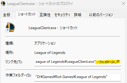 例:“~\LeagueClient.exe” –locale=ko_KR - ショートカットを起動すると韓国語で表示されるはず