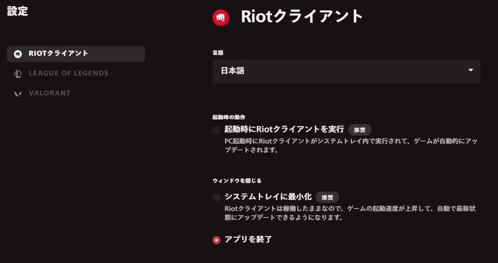 - 設定 > Riot クライアント を開き,”ウィンドウを閉じる”のチェックを下記のように設定する
