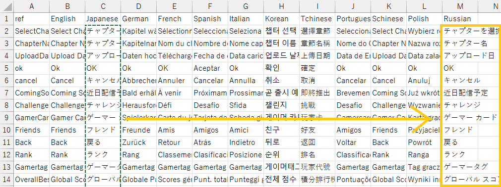- Japanese列にある日本語をすべてコピーしてRussian列に貼り付けて上書き保存する