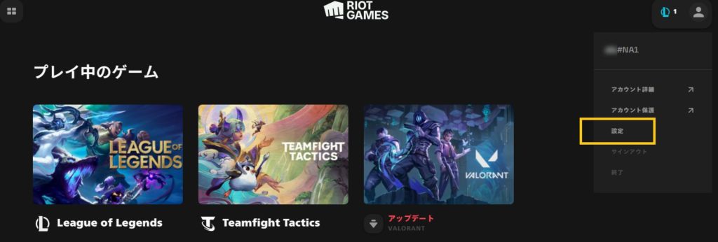 1. Riotクライアントを立ち上げて右上の人マークをクリックして設定を選択します(参考画像1).