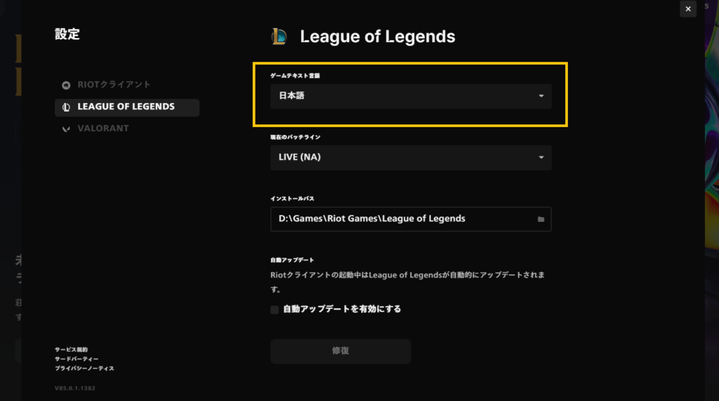 2. 次にLoLのゲームテキスト言語を「日本語」にします(参考画像2).