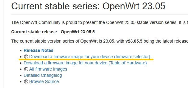 まずはOpenWrtの公式サイトより”Download a firmware image for your device (firmware selector)“を選択します.