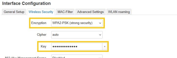 無線についてはデフォルトで無効化されていますが,「Network」→「Wireless」と進み,有効化する前にEditで”Contry Code”を”JP”へ変更し,またESSIDの設定と暗号化,パスワードの設定を忘れずにしておきましょう.