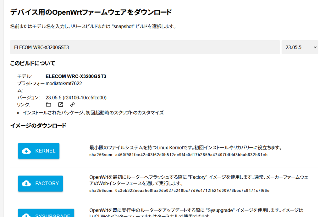 続いてデバイスを選択(今回はELECOM WRC-X3200GST3)し,FACTORYのイメージをダウンロードします.