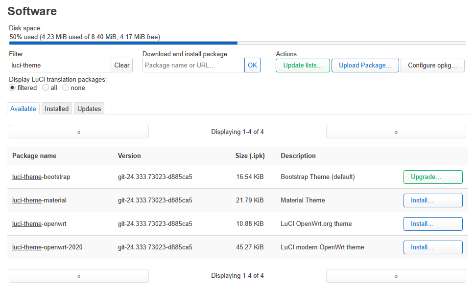 もしデフォルトのテーマが気に入らなければ他のテーマを探しましょう.簡単なものは「Software」で”luci-theme”等で検索すると出てきます.