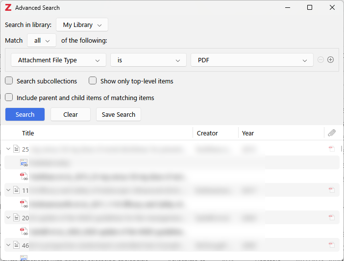 “Save Search”を選択して検索情報を保存のうえ,PDFファイルを一つ選択した状態で”Ctrl+A”を行うことでPDFファイルだけを選択することができますので右クリックして削除します.