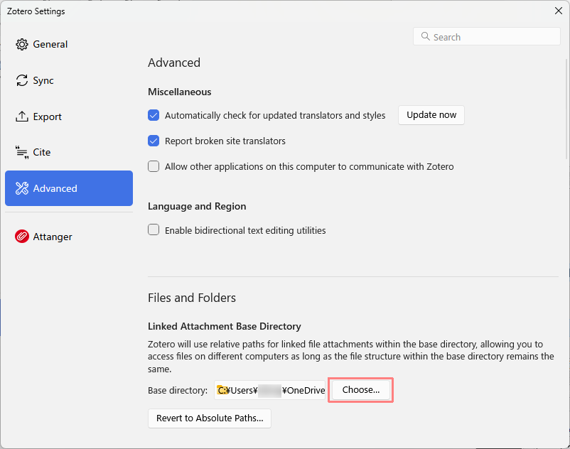 - Zoteroの設定メニューから「詳細」タブを選択し,「リンクされた添付ファイルのベースディレクトリ」を「Zotero7Attachments」フォルダのパスに設定します.